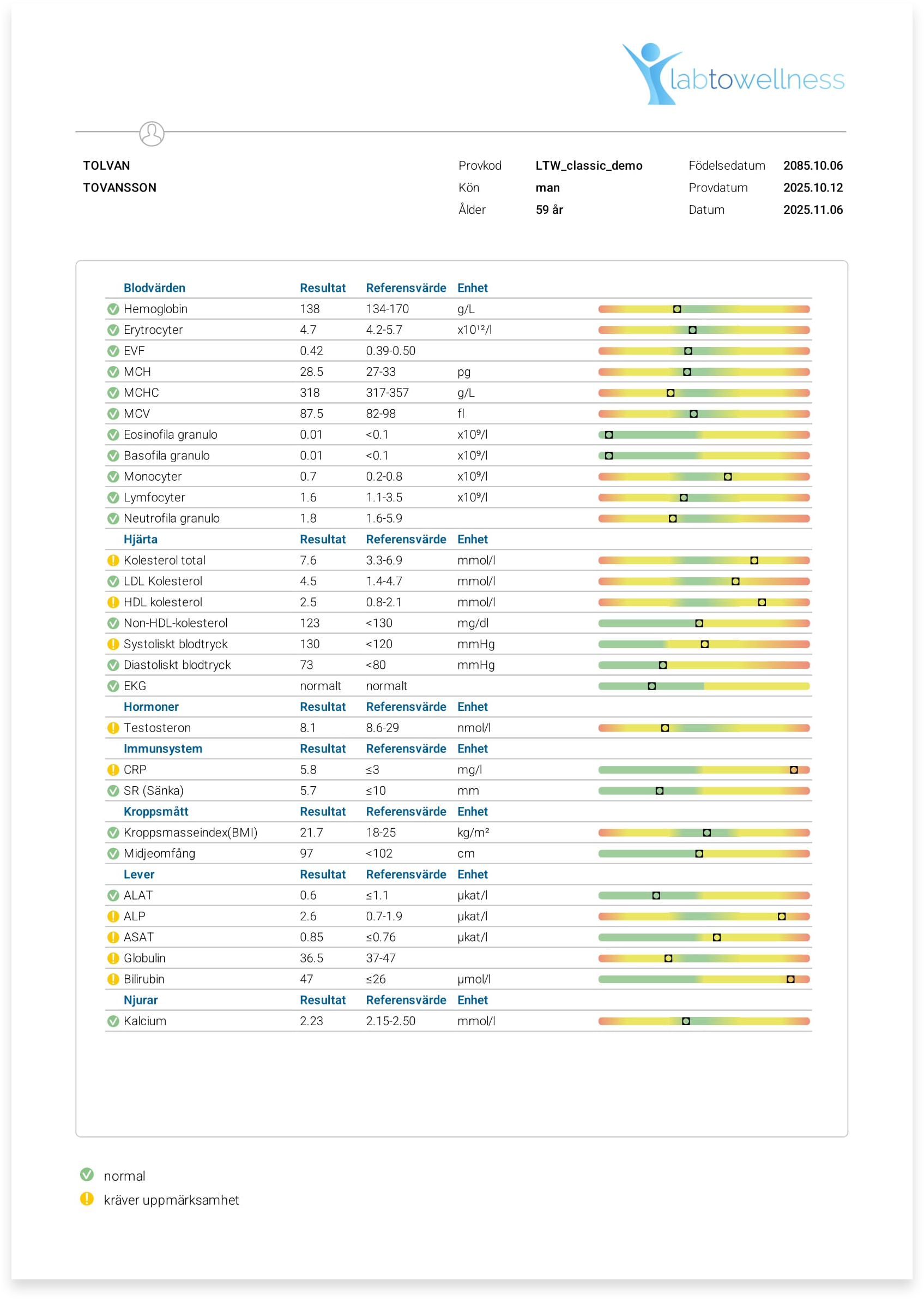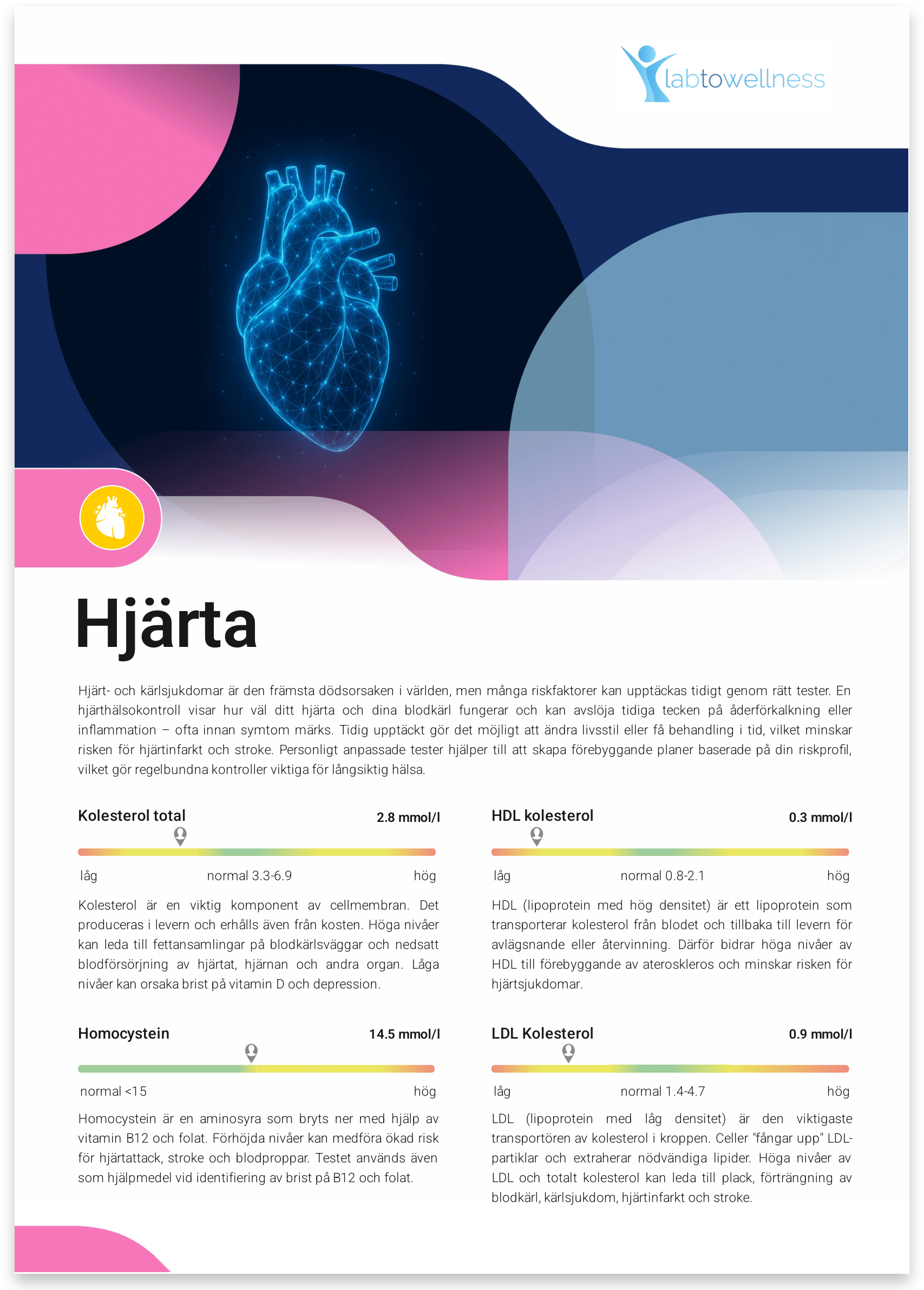 Rapporter för både små och stora laboratorietestpaket – automatiserade och patientfokuserade, med enhetlig design, tydliga förklaringar och personliga rekommendationer.